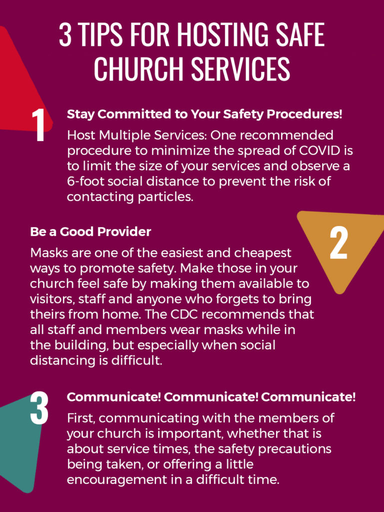 Host Multiple Services: One recommended procedure to minimize the spread of COVID is to limit the size of your services and observe a 6-foot social distance to prevent the risk of contacting particles. Having multiple services is a great way to follow the guidelines, while also making sure that your church is reaching as many people as they can in-person. As far as group limits and social distancing guidelines, every state and local government is different so make sure to check and see what the guidelines are in your area.