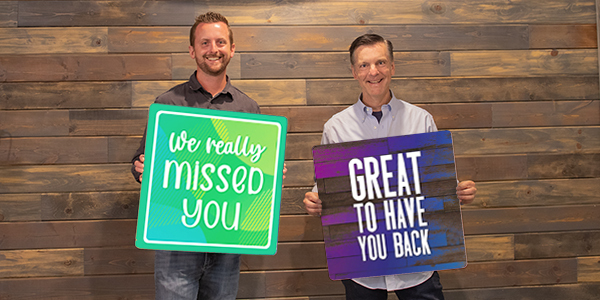 Flag Banners, Street Signs and Yard Signs are great signage options for both the inside and outside depending on the layout of your parking lot and building. Signs like “We are open”, “Together again”, and “Back again” are great to let people know that you are meeting in person.