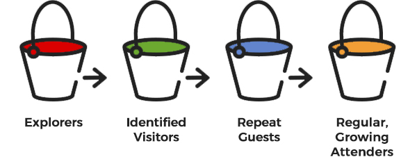Consider your assimilation strategy as a set of buckets. Each bucket holds people from all walks of life and all different spiritual backgrounds. Each bucket is a temporary holding ground. Your church’s goal is to collect as many people into each bucket as possible and move them onto the next bucket. Each step they take will be the result of God working in them in conjunction with an intentional assimilation system at your church. The buckets are Explorers >> Identified Visitors >> Repeat Guests >> Regular, Growing Attenders.